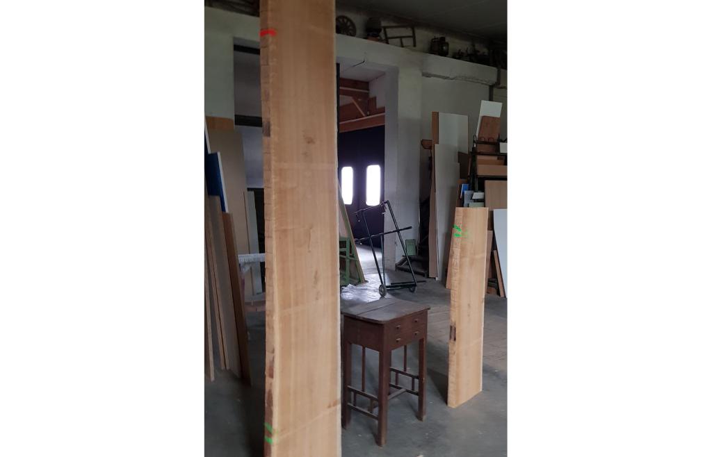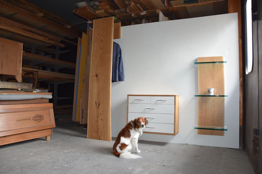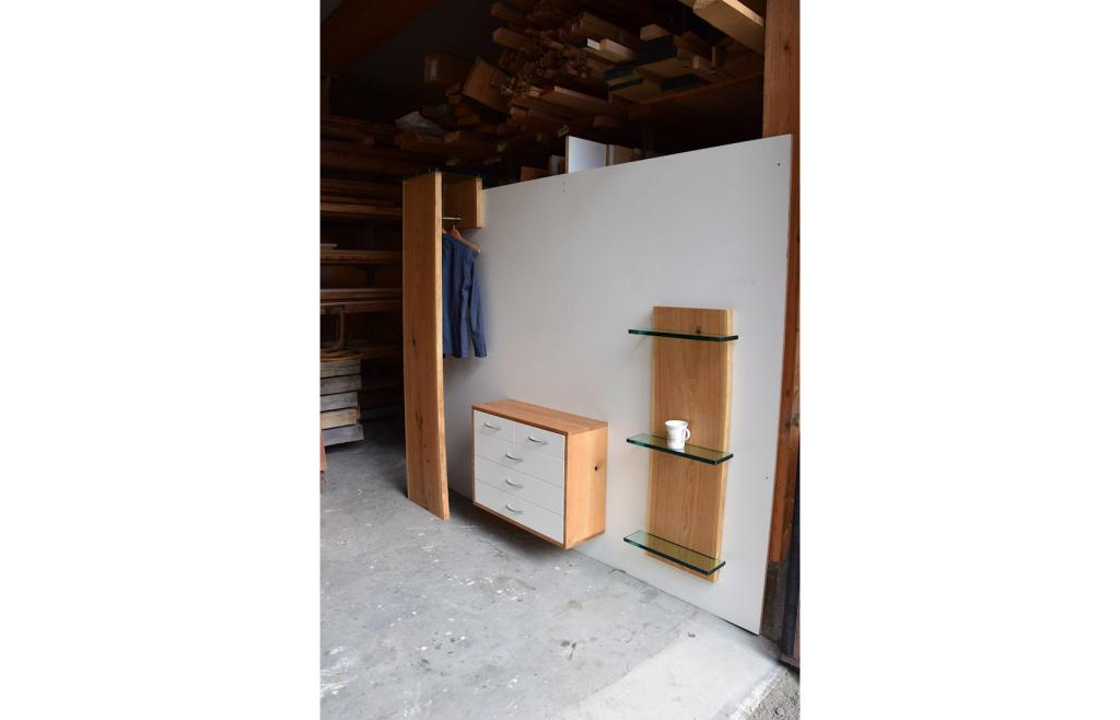 Auf dieser Seite sehen Sie die Entstehung einer Garderobe aus einem Stück Massivholzbohle und die weitere Bearbeitung bis zum Endprodukt. Die Oberfläche ist gebürstete Eiche mit Hartwachs geölt. Die Schubkästen haben hochglanzlackierte Vorderfronten und das kleine Regal besitzt Glasablageflächen.