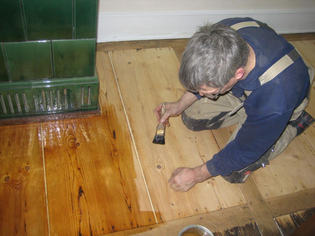 Im zweiten Beispiel sehen Sie einen alten Fichtefussboden mit Eichequerriegeln vor und nach der Behandlung.