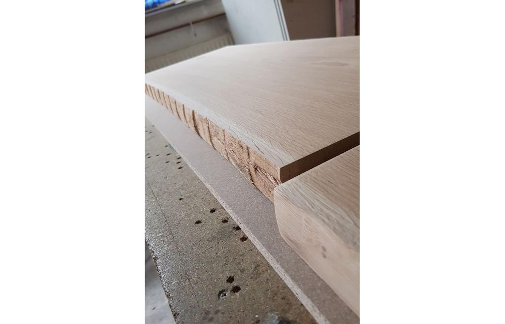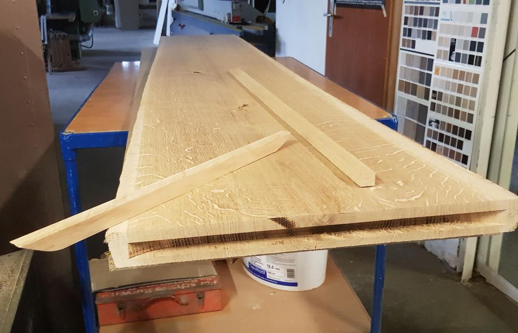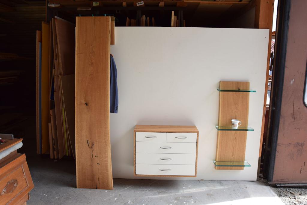 Auf dieser Seite sehen Sie die Entstehung einer Garderobe aus einem Stück Massivholzbohle und die weitere Bearbeitung bis zum Endprodukt. Die Oberfläche ist gebürstete Eiche mit Hartwachs geölt. Die Schubkästen haben hochglanzlackierte Vorderfronten und das kleine Regal besitzt Glasablageflächen.
