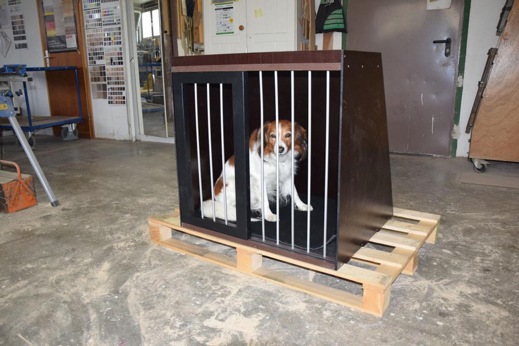 Die unten dargestellte Hundebox ist eine Sonderanfertigung eines Kunden, damit auch das vierbeinige Familienmitglied auf Reisen oder zum Tierarzt sicher und ohne Stress im Auto einen Platz bekommt. Die Box wurde speziell an das Fahrzeug des Kunden angepaßt.